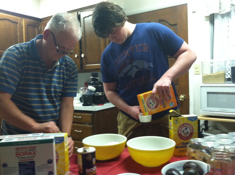We made a huge batch of Laundry and Automatic Dish Soap last night. ย This was a great Family Home Evening Activity!